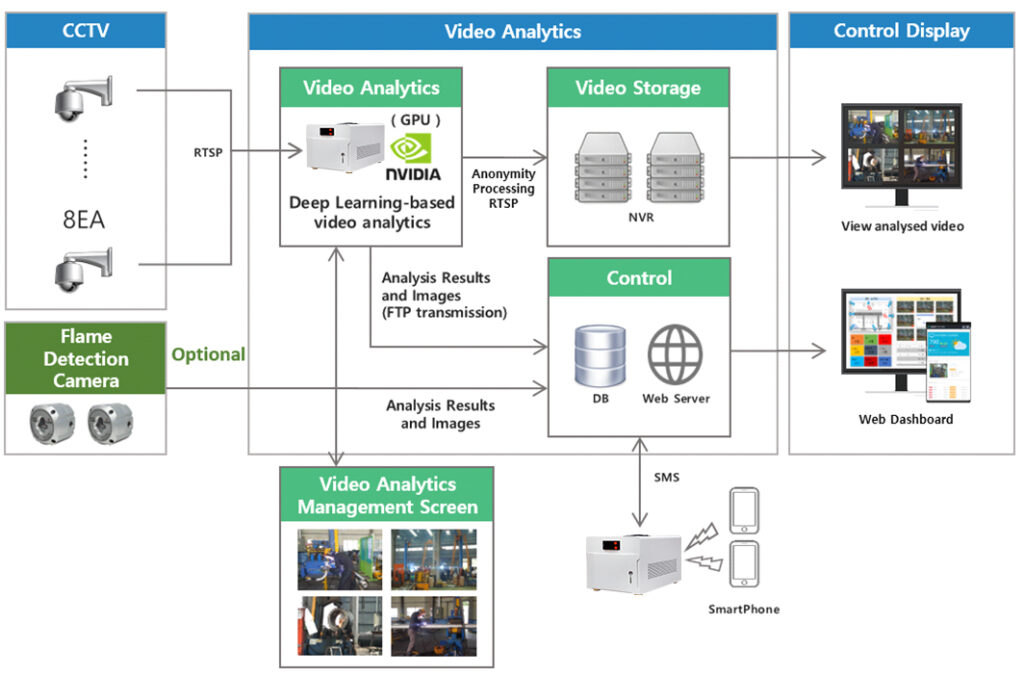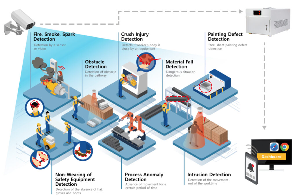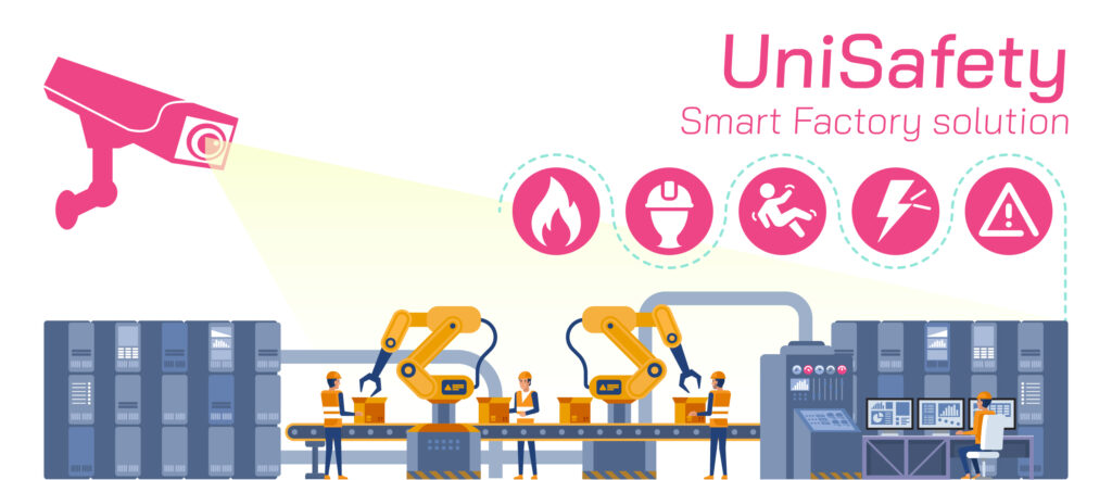 UniSafety is based on video analytics technology enhanced with deep learning that allows detection of various dangerous situations, such as fire, falling materials, abnormal process, crush injury danger, non-wearing of safety equipment, intrusion, etc., that can occur during the production process. In the case of an accident or unusual situation, the system informs the safety supervisors via web-dashboard notification, text message, and loudspeaker. It also offers motion detection for detecting unauthorized access or intrusions. This can allow a more open working space without using barriers to keep out intruders.